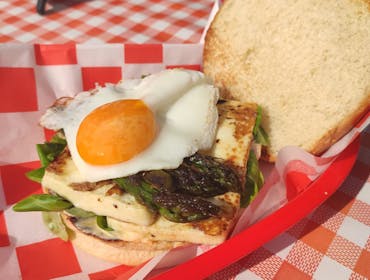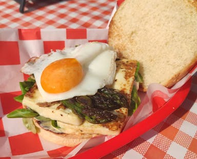 Bułka maślana, ketchup, burger wołowy lub halloumi, roszponka, szparagi, jajko sadzone