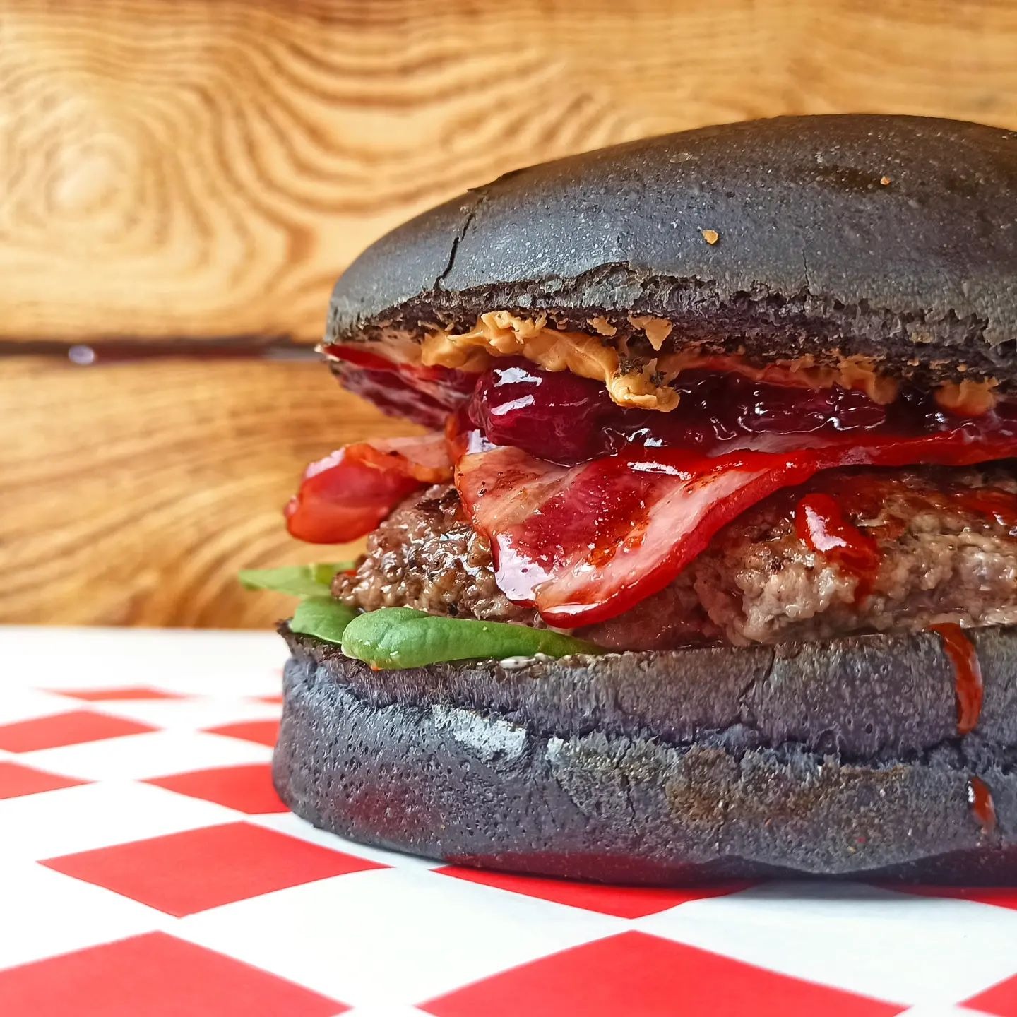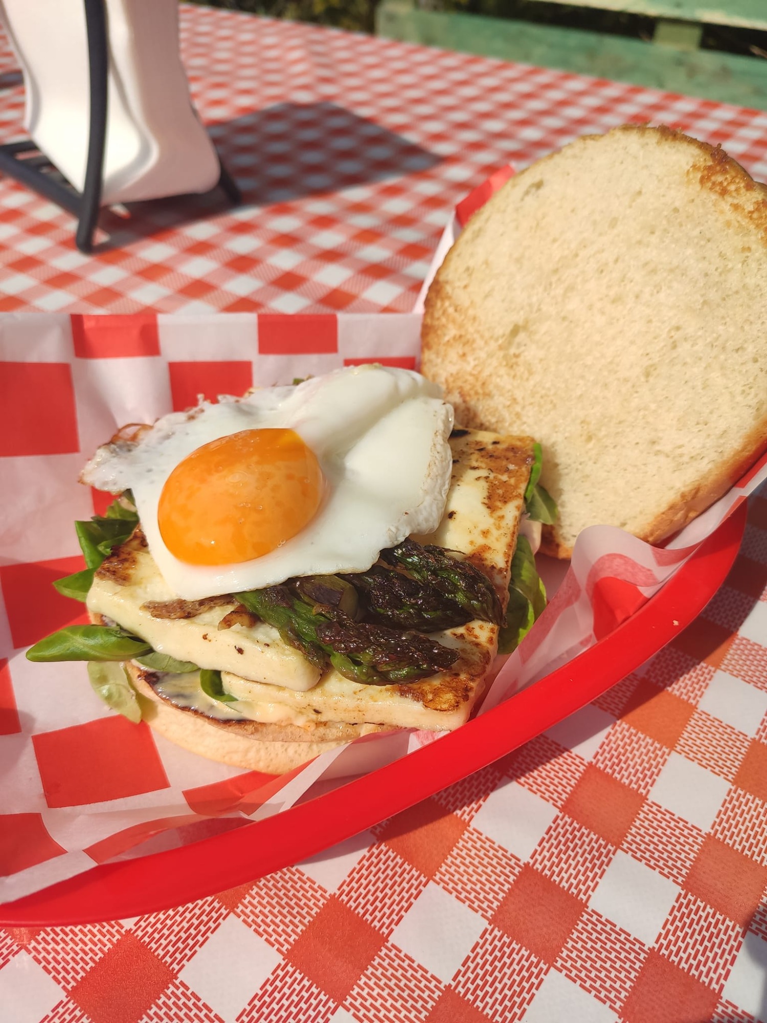Bułka maślana, ketchup, burger wołowy lub halloumi, roszponka, szparagi, jajko sadzone