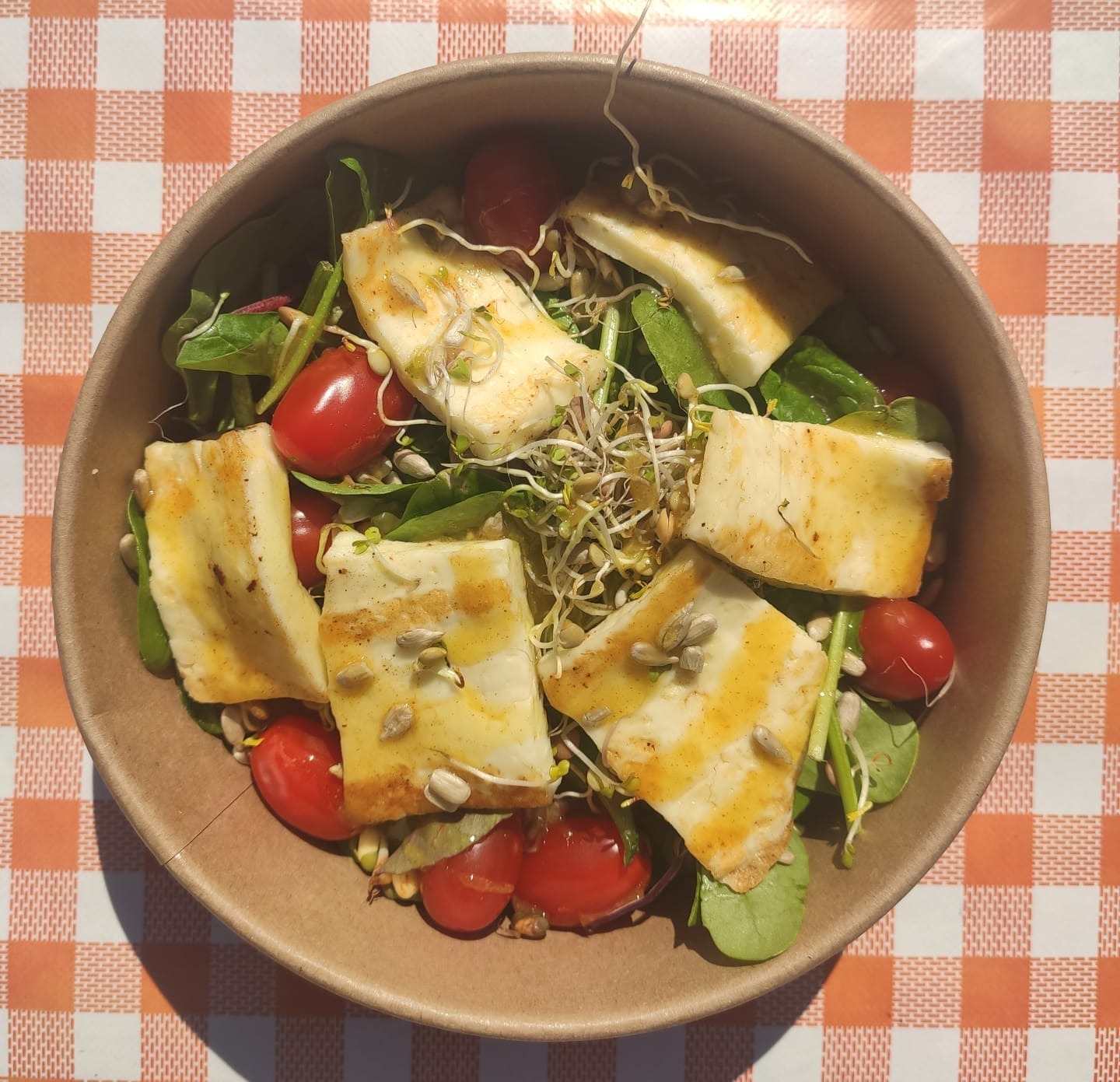 Mix liści, kiełki, haloumi, pomidorki koktajlowe, prażony słonecznik, sos miodowo musztardowy