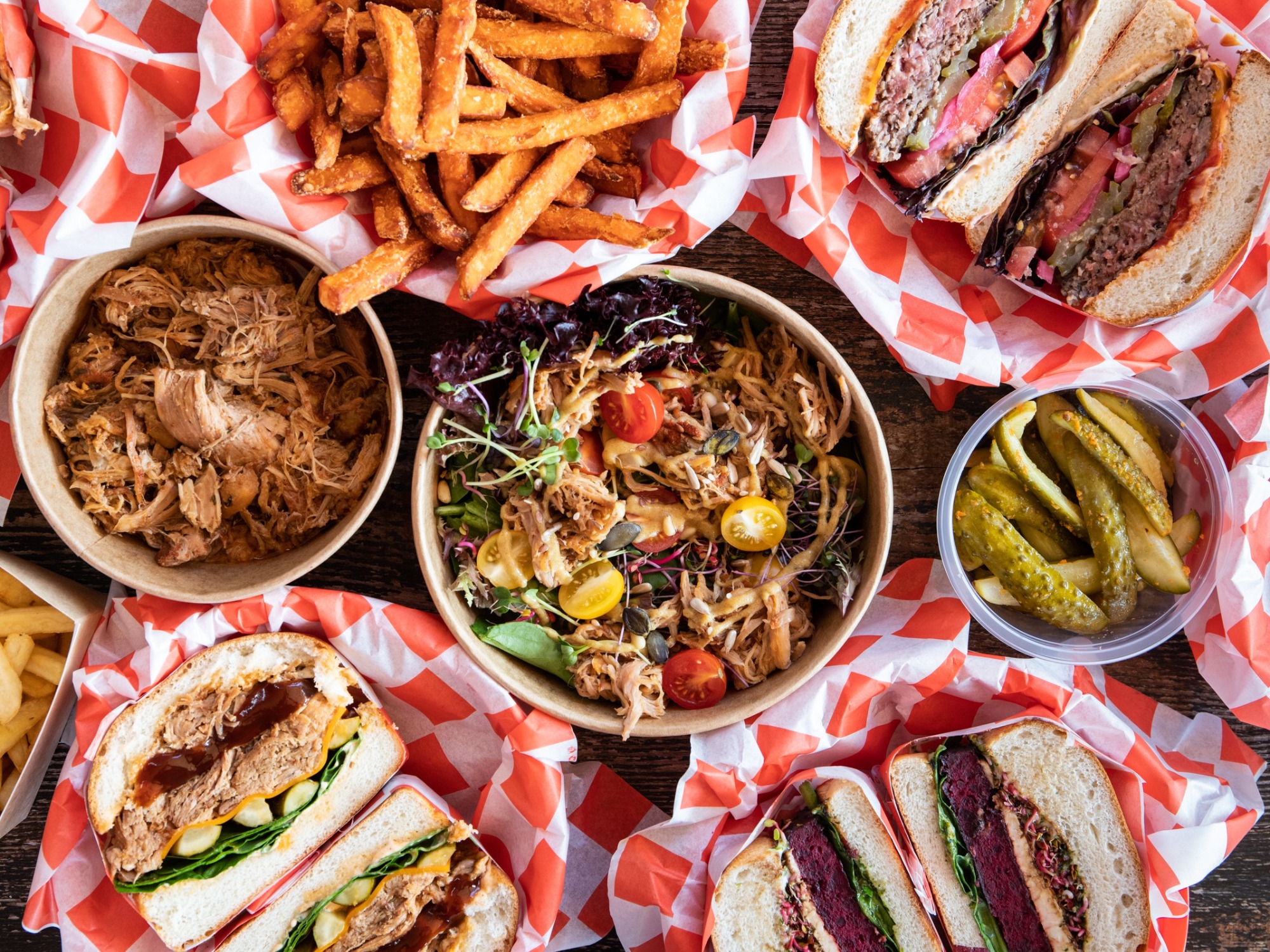łopatka wieprzowa, nasze pikle, sos bbq, ser mimolette, colesław czerwony, bułka pełnoziarnista, nasze mayo, szpinak baby -